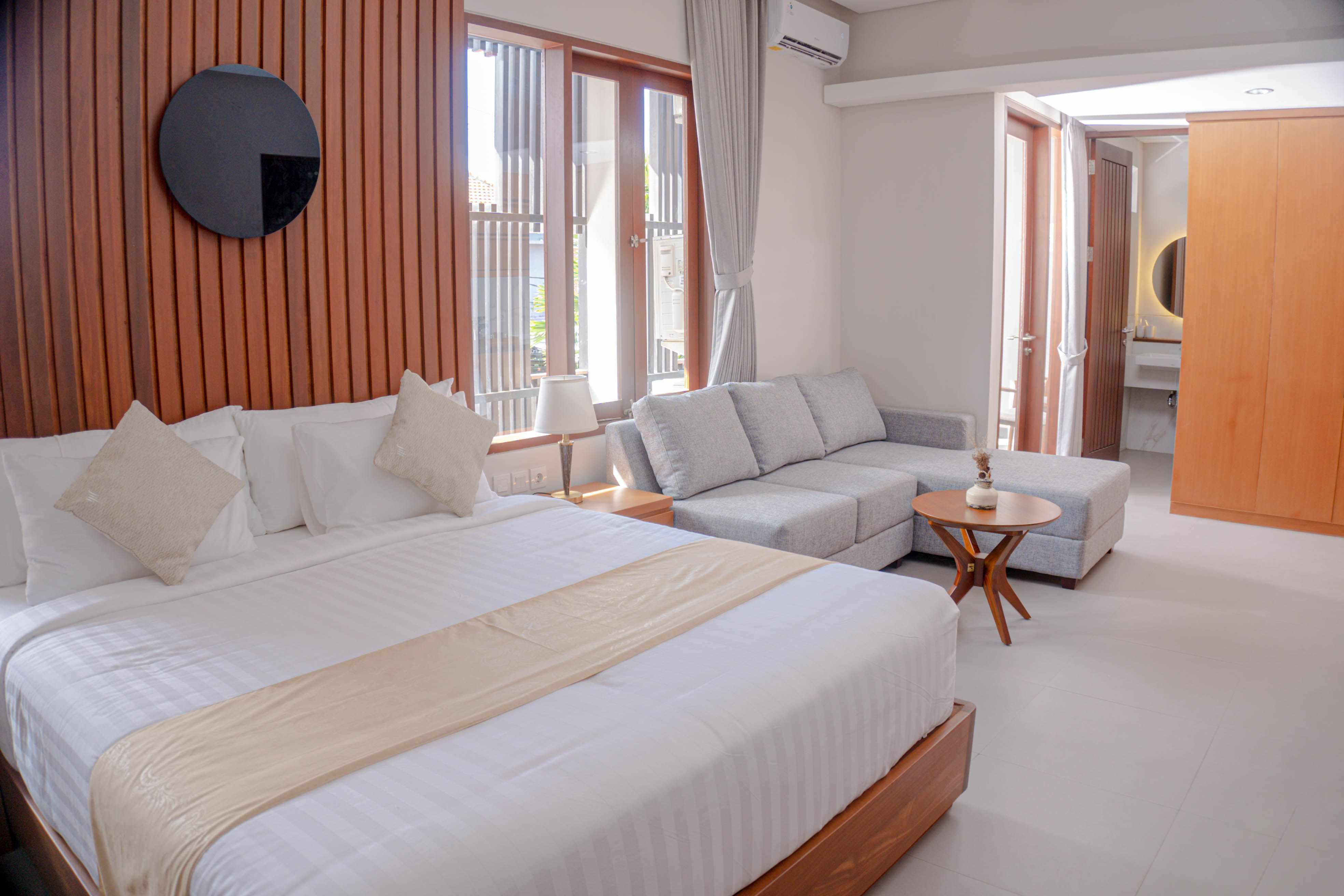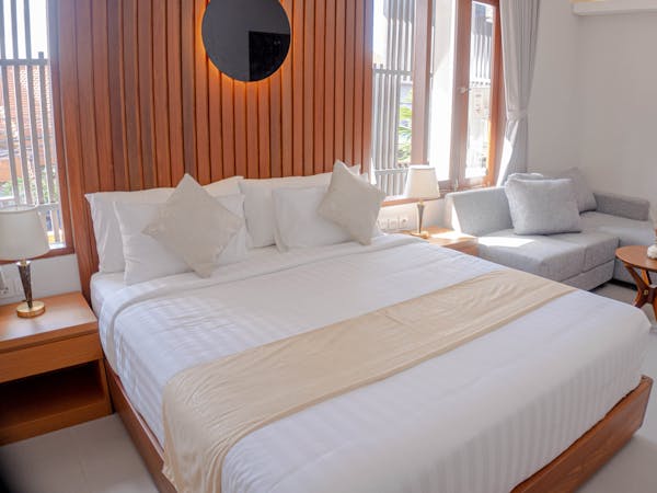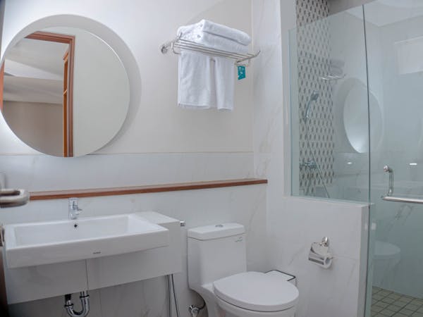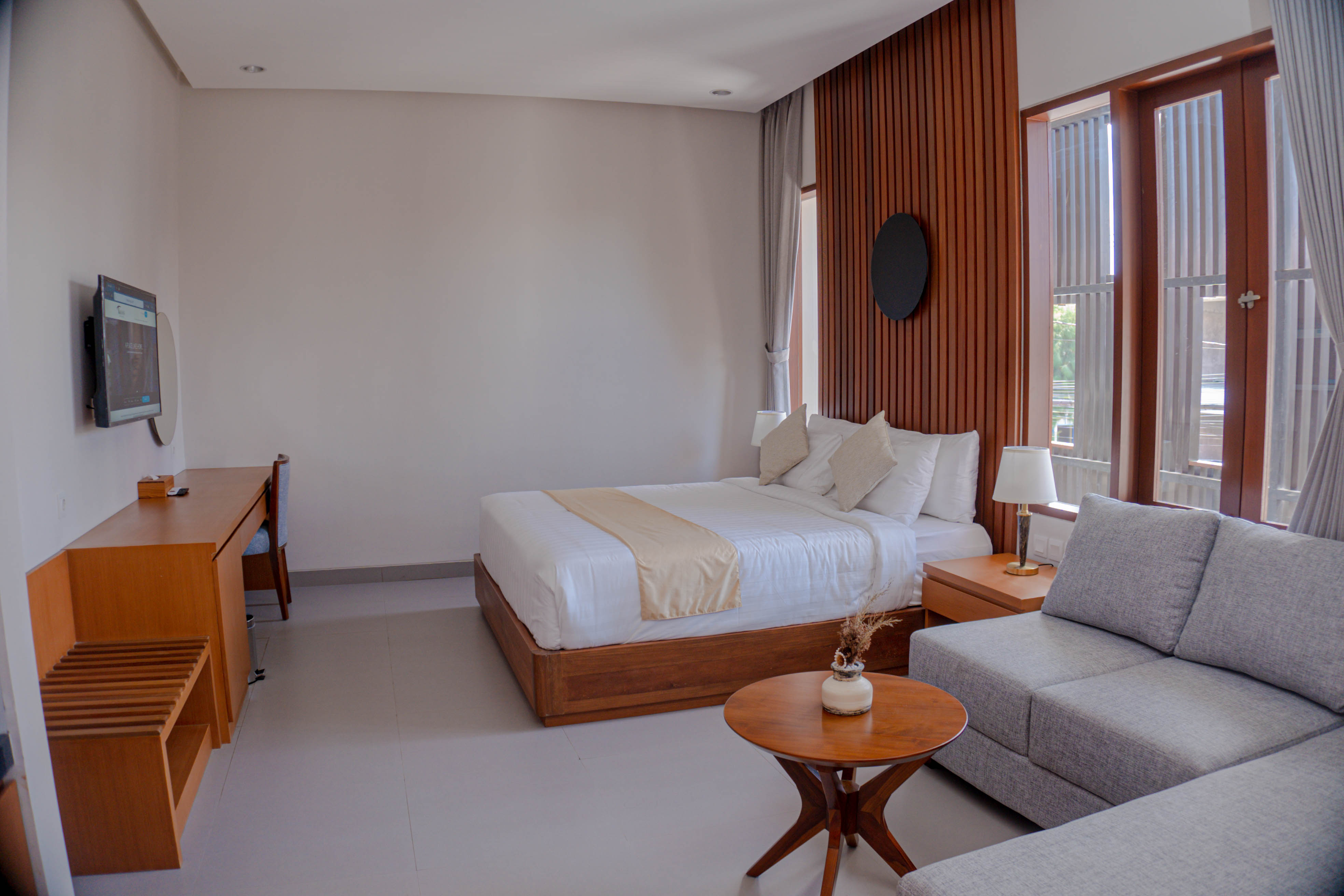 A comfort room with air conditioning, 43” smart tv, sitting area, balcony, small pantry, and mini fridge. Bathroom amenities are also provided to pamper your vacation. The windows and balcony of this room type are facing the main road with a city view.