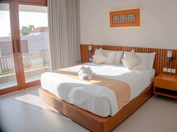 A comfort room with air conditioning, 32" smart tv, balcony and mini fridge. Bathroom amenities are also provided to pamper your vacation. The windows and balcony of this room are facing the garden and pool area.